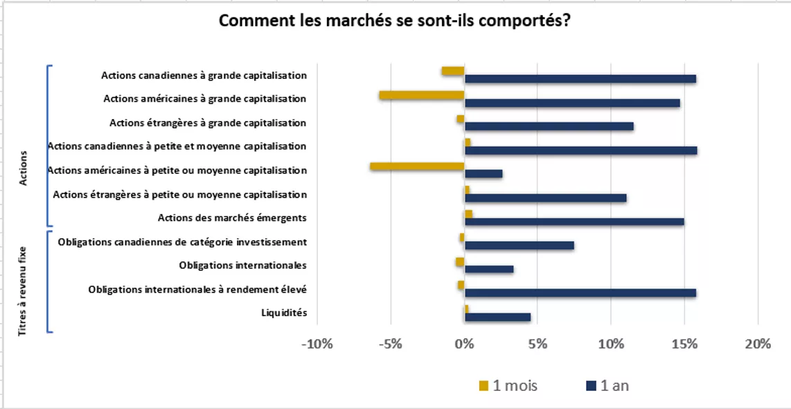 Ce graphique montre le rendement des marchés boursiers et des titres à revenu fixe au cours du mois et de l’année précédents.