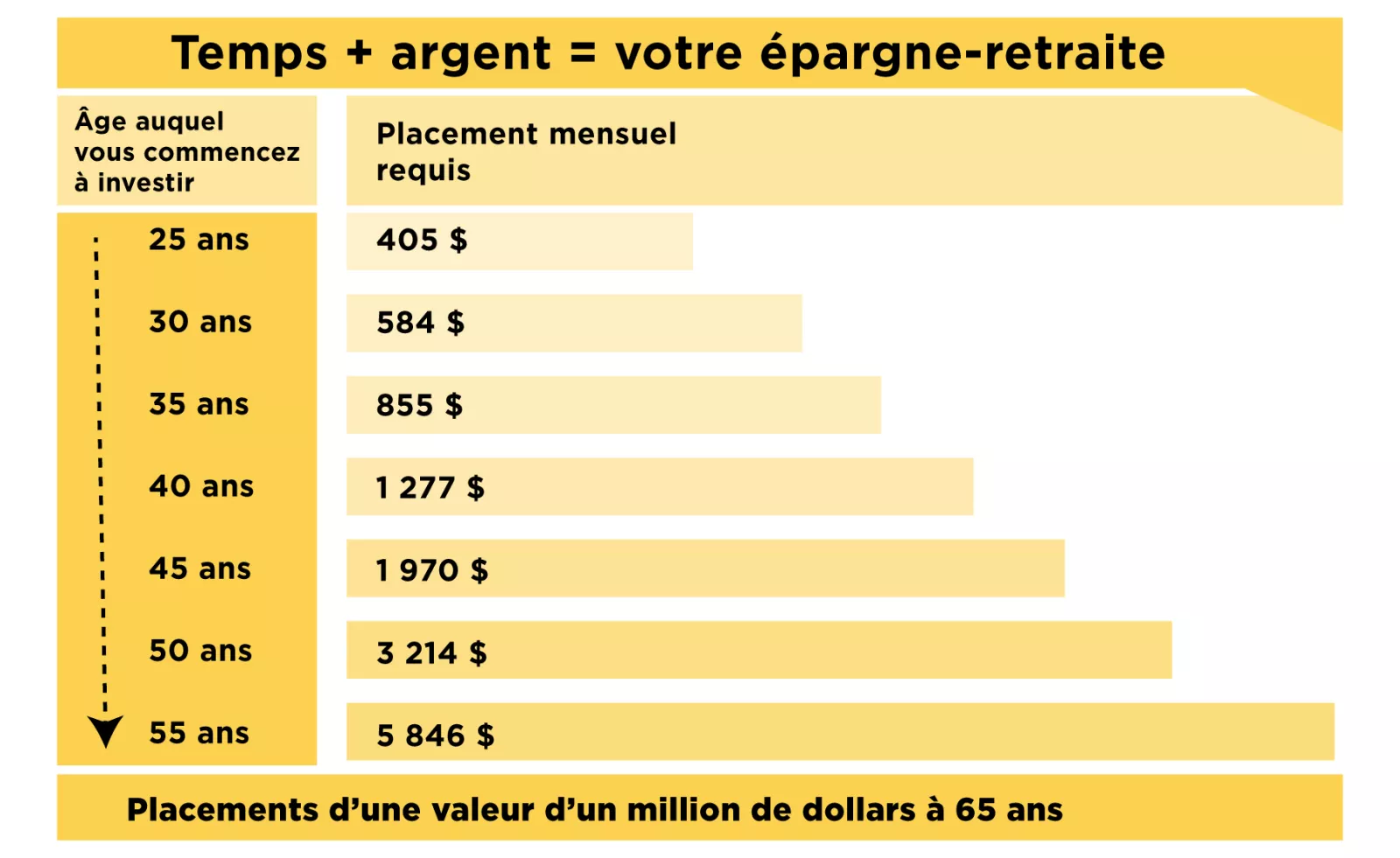 Voici un exemple : si vous souhaitez accumuler un million de dollars avant l’âge de 65 ans, vous devrez mettre un certain montant de côté chaque mois pour atteindre cet objectif. Plus vous attendez, moins vous aurez de temps pour le faire et plus vos placements mensuels devront être élevés.