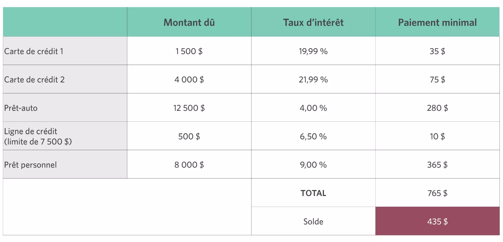 - La méthode de la boule de neige: Cette méthode vise à rembourser d’abord la dette la plus petite. L’objectif est de réduire le nombre de créanciers et de donner à la personne un sentiment d’accomplissement qui l’aidera à rester motivée. Comme dans le cas d’une boule de neige, les effets de chaque paiement sont minimes au départ, mais à mesure que les dettes sont remboursées et que des créanciers sont éliminés, les économies réalisées peuvent servir à rembourser la deuxième dette la plus petite, ce qui en accroît l’effet. En utilisant cette méthode, tous les paiements minimaux seraient effectués, puis la ligne de crédit serait remboursée. Après le deuxième mois, la ligne de crédit serait remboursée et le paiement minimal de 10 $ pourrait être ajouté aux 435 $, ce qui porterait le montant disponible pour rembourser les dettes à 445 $ par mois. Viendrait ensuite le remboursement de la carte de crédit 1.