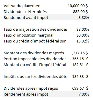 Supposons que vous détenez une action donnant droit à un dividende dans un compte imposable. Votre valeur de placement est de 10 000 $ et vous recevez 500 $ en dividendes déterminés. Un dividende déterminé est un dividende provenant d’une société qui a été imposée sur le revenu avant que l’argent ne vous soit versé. Supposons également que votre taux d’imposition marginal est de 30 %.