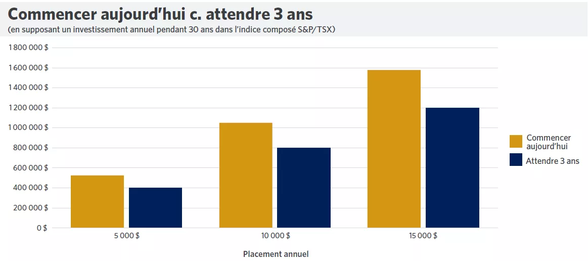 Ce graphique montre qu’avec le temps, le fait d’attendre avant d’investir pourrait avoir un coût important.