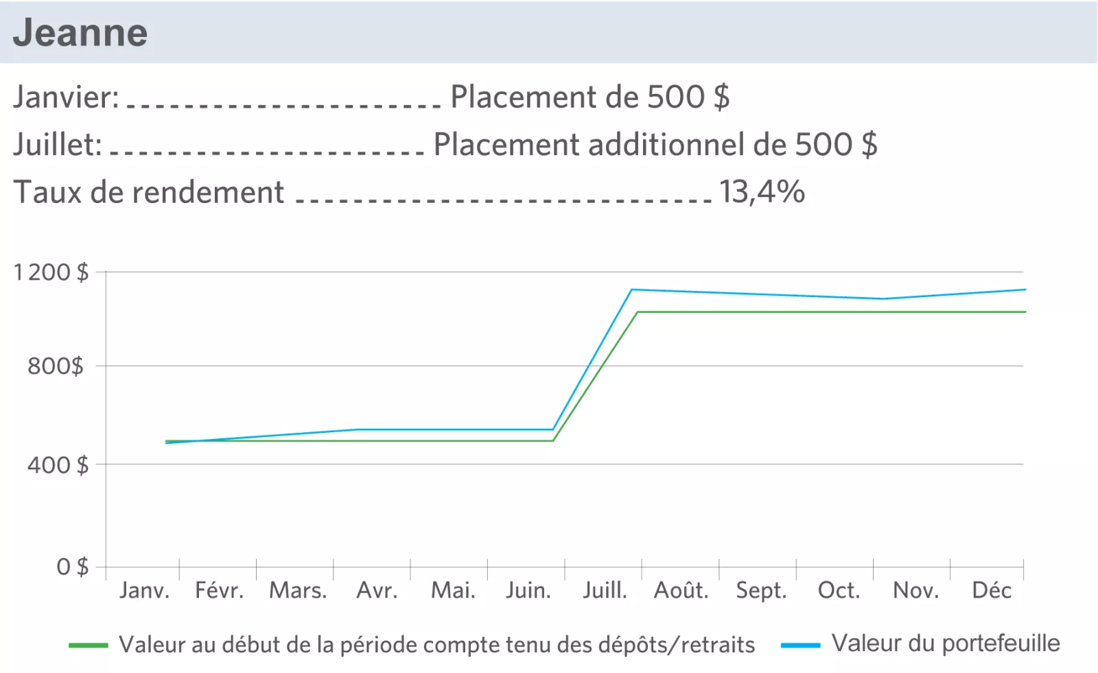 L’image 2 montre le taux de rendement personnel d’un deuxième investisseur hypothétique, Jeanne, qui a initialement investi 500 $ au début d’une période de 12 mois, puis effectué un deuxième dépôt de 500 $ six mois plus tard. La ligne verte montre les montants que Jeanne a ajoutés ou retirés du portefeuille, notamment une hausse en juillet lorsque Jeanne a effectué son deuxième dépôt de 500 $.