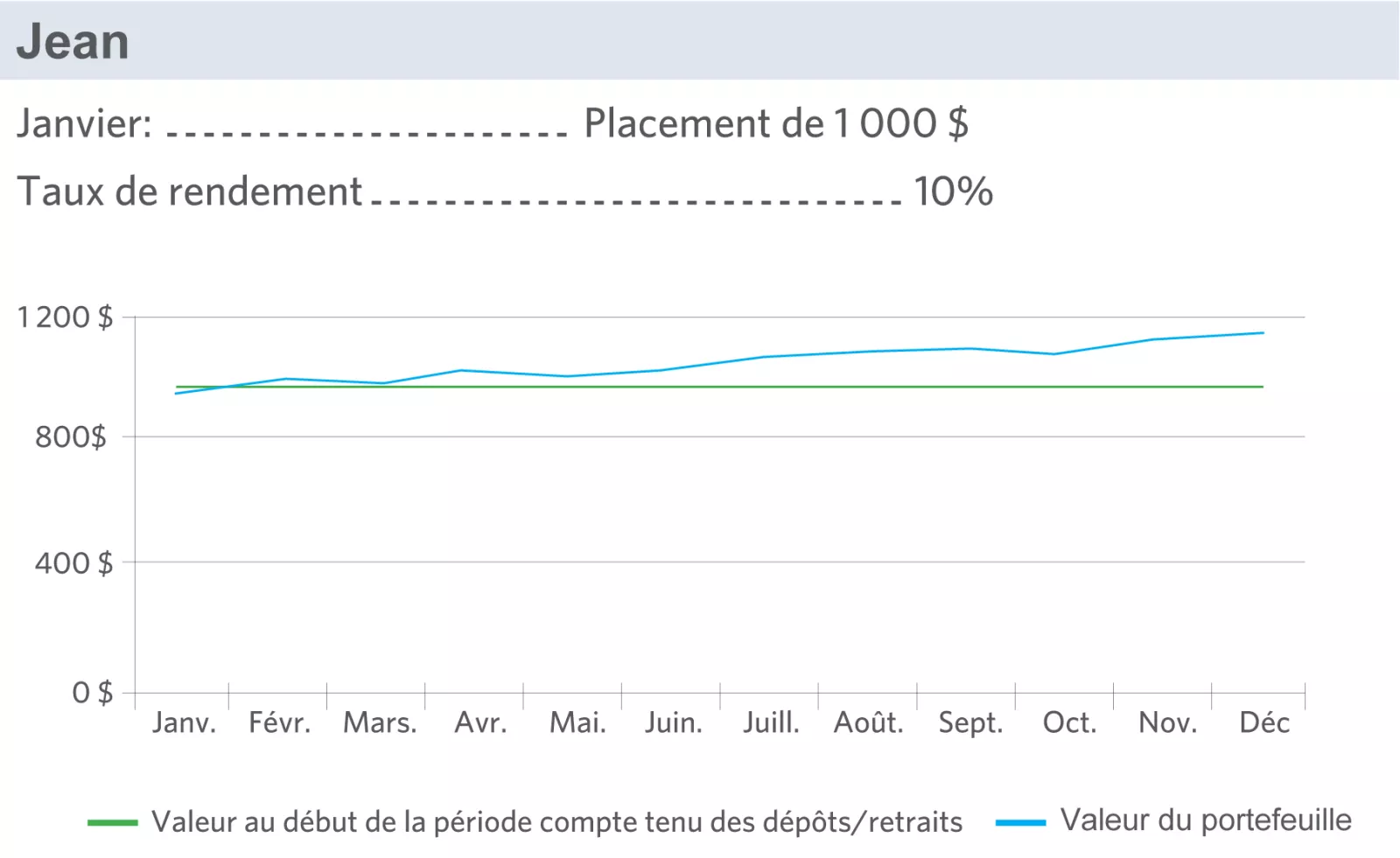 L’image 1 montre le taux de rendement personnel d’un investisseur hypothétique, Jean, qui investit initialement 1 000 $ au début d’une période de 12 mois. La ligne verte montre les montants que Jean a ajoutés ou retirés du portefeuille. Ceux-ci ne changent pas puisque Jean n’a pas fait de dépôt ou de retrait après son placement initial de 1 000 $. La ligne bleue ascendante montre la croissance de la valeur du placement de Jean au fil du temps. Puisque Jean n’a effectué aucun placement ou retrait additionnel hormis son placement initial de 1 000 $, son taux de rendement personnel est identique au pourcentage en dollars, soit 10 %.