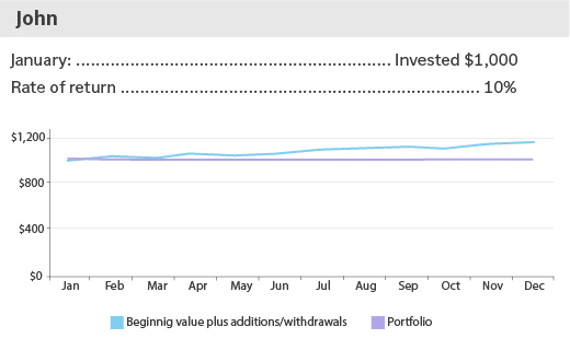 Image 1 shows John's personal rate of return, as he initially invests $1,000 at the beginning of a 12-month period. The green line depicts the dollar amounts John added to or took out of the portfolio, which remains flat, since he did not add to or withdrawal from his initial $1,000 investment. The upward-trending blue line illustrates how the value of John's investment grew over time. Because John made no additional investments or withdrawals besides his initial $1,000 investment, his personal rate of return is identical to the dollar percentage, 10%.