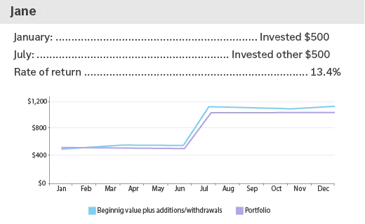 Jane's rate of return is higher because half of her deposit was not invested until July, which means her investments had to perform better to achieve that same $100 growth. The upward-trending blue line illustrates how the value of Jane's investments grew over time. Jane's personal rate of return is higher, at 13.4%, because half of her deposit was not invested until July, meaning her investments had to perform better to achieve that same $100 growth.