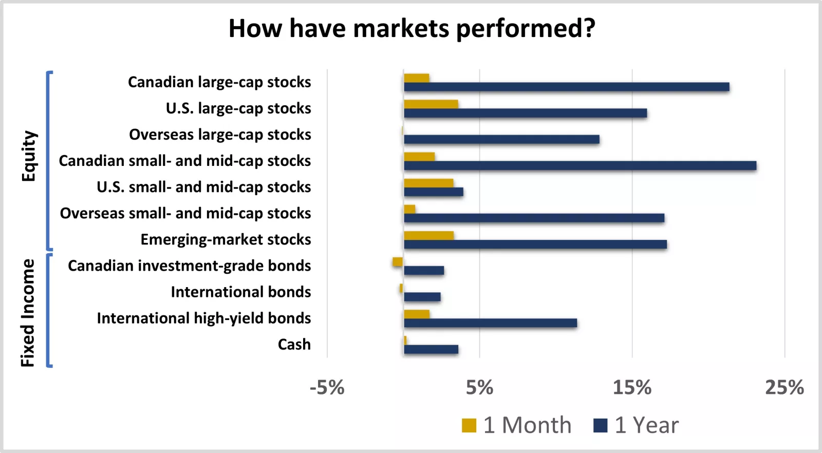 This chart shows the performance of equity and fixed-income markets over the previous month and year.