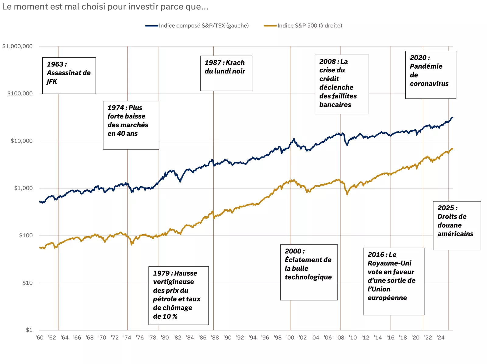 Au fil du temps, les investisseurs ont eu de nombreuses raisons convaincantes de rester en marge des machés. Chaque situation a suscité le même sentiment : « Cette fois-ci, c’est différent. C’est pire que jamais ». Pourtant, malgré tous ces défis, le marché a constamment progressé à long terme.