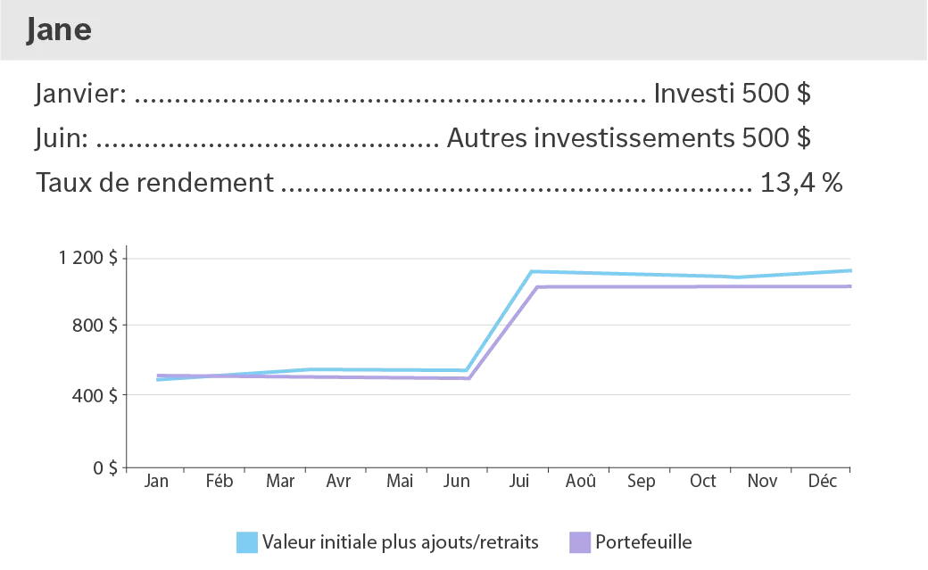 L’image 2 montre le taux de rendement personnel d’un deuxième investisseur hypothétique, Jeanne, qui a initialement investi 500 $ au début d’une période de 12 mois, puis effectué un deuxième dépôt de 500 $ six mois plus tard. La ligne verte montre les montants que Jeanne a ajoutés ou retirés du portefeuille, notamment une hausse en juillet lorsque Jeanne a effectué son deuxième dépôt de 500 $.