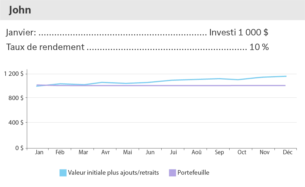 L’image 1 montre le taux de rendement personnel d’un investisseur hypothétique, Jean, qui investit initialement 1 000 $ au début d’une période de 12 mois. La ligne verte montre les montants que Jean a ajoutés ou retirés du portefeuille. Ceux-ci ne changent pas puisque Jean n’a pas fait de dépôt ou de retrait après son placement initial de 1 000 $. La ligne bleue ascendante montre la croissance de la valeur du placement de Jean au fil du temps. Puisque Jean n’a effectué aucun placement ou retrait additionnel hormis son placement initial de 1 000 $, son taux de rendement personnel est identique au pourcentage en dollars, soit 10 %.